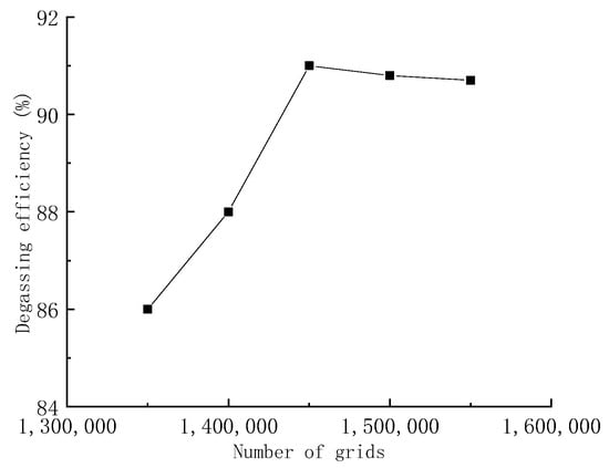 Figure 2 is the irrelevance test diagram under five types of grid cells. It can be seen from the figure that the degassing rate was the lowest when the grid cells number was 1,350,000. The degassing efficiency also increased with an increase in the level. The grid cells number of 1,450,000 resulted in the best rate, but too many grid cells not only increased the calculation time but even reduced the separation efficiency. The separation efficiency was the best when the number of grid cells was about 1,450,000. The number of grid cells in this study was 1,449,887.