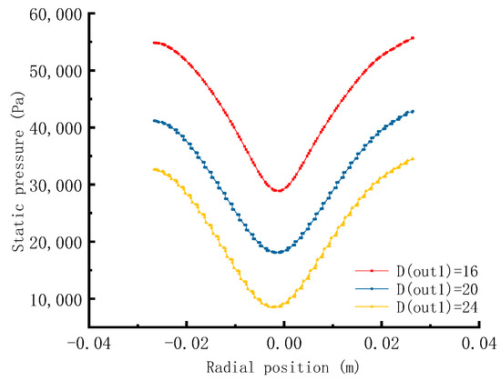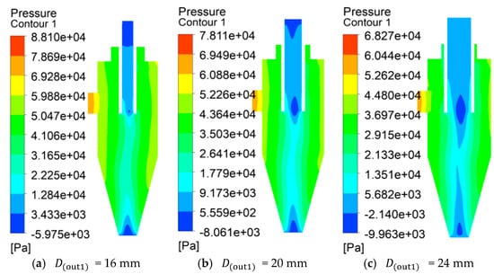 It can be concluded from Figure 3 that the pressure in the center area of the exhaust port and the discharge port of the cyclone was the lowest, and the pressure at the inlet was the highest; the internal pressure was distributed symmetrically along the central axis, gradually decreasing from the outside to inside. The larger the diameter of the exhaust port, the smaller the pressure drop, which means that the smaller the size of the exhaust port, the more the internal liquid accumulation caused the pressure drop to increase. It can be seen from Figure 4 that the pressure difference was the largest when = 16 mm, and the overall pressure was the smallest among the three structures when = 24 mm; as the diameter of the exhaust port increased, the pressure gradient gradually decreased, and due to the increase in , the static pressure and pressure loss gradually decreased.
