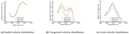 It can be seen from Figure 5 that the radial velocity distributions of the three cyclones were almost the same and distributed symmetrically; the tangential velocity presents an “M2” shape, and the velocity gradually decreased as the position of the axis was approached. There was a maximum value on both sides of the center, and the tangential velocity was at a maximum when = 24 mm and minimum when = 16 mm, indicating that the ability of bubbles to flow toward the center in the radial position increased with an increase in the diameter of the exhaust port; the axial velocity was distributed axisymmetrically along the central axis. As it approaches the axis position, the velocity gradually increased. The central axial velocity was at a maximum when = 16 mm. It was the smallest when = 24 mm, which indicates that the ability of bubbles to flow toward the exhaust port in the axial position decreased with an increase in the exhaust port diameter. As the size of the exhaust port increased, if the gas outlet was in the positive direction, the axial velocity was convex at the center, which means that as the gas phase at the center flowed upward, liquid flowed downward on both sides.
