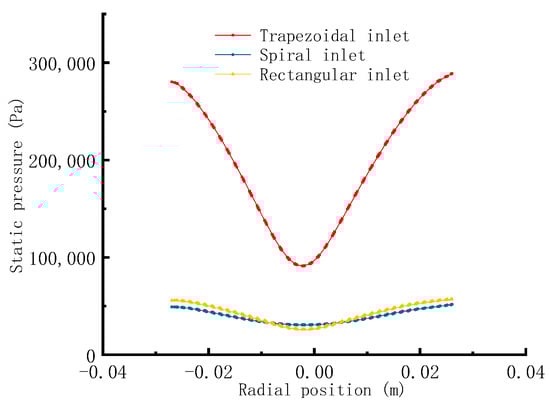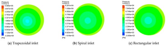 It can be seen from Figure 7 that the cross-sectional pressure shows a layered decrease from the periphery to the middle area, and the overall pressure gradient shows an eccentric circle distribution. It can be concluded from Figure 8 that the pressure drop of the Z-section trapezoidal inlet was the largest; the drop between the rectangular and spiral inlets was not much different. The pressure drop of the trapezoidal inlet was five times that of the rectangular and spiral inlets, indicating that the trapezoidal inlet had a large pressure loss, which is not conducive to the flow of bubbles.