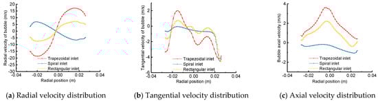 Figure 9 shows the trend lines of the three sub-velocities in section Z. These three sets of parameters can well reflect the changing law for the flow field in the separator and reflect the vortex motion in the flow field. After the mixed liquid was separated by the swirling flow inside, the process of moving the bubbles upward and out was realized by the parameter of radial velocity. It is apparent from the radial velocity distribution curve in the figure that its distribution was basically symmetrical; the radial movement speed of the trapezoidal inlet bubble was the fastest, and that of the rectangular inlet bubble was the slowest. This shows that the trapezoidal inlet had the strongest ability to flow toward the center in the radial position, while the rectangular inlet had a relatively weak ability; theoretically, the greater the tangential velocity, the better the separation. From the tangential velocity curve in the figure, it can be observed that the tangential velocity was the largest at the trapezoidal inlet and the smallest at the spiral inlet. However, the overall tangential velocity profile of the trapezoidal inlet is extremely unstable and has no symmetry, indicating that the flow field at the trapezoidal inlet was extremely unstable, which is not conducive to the swirling separation of bubbles. From the axial velocity distribution curve in the figure, it can be seen that the axial velocity distribution has a high middle and low sides. The velocity distribution of the spiral inlet is the lowest among the three structures as a whole, indicating that there was no strong swirling flow inside the spiral inlet cyclone.