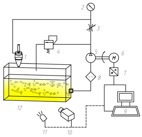 Experimental schematic diagram. 1—Gas–liquid cyclone separator; 2—Pressure gauge; 3—Throttle valve; 4—Safety valve; 5—Three screw pump; 6—Three-phase asynchronous motor; 7—Frequency converter; 8—Filter; 9—Computer; 10—High-speed camera; 11—Sheet light source; 12—Tank.