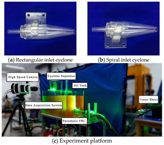 The rectangular inlet and spiral inlet cyclone with better bubble flow effects, according to the simulation analysis, were selected for experimental exploration. Figure 12 and Figure 13 are the system schematic and physical diagrams of the constructed visual experimental platform. In order to visualize the bubble flow in the cyclone, the rectangular inlet and spiral inlet cyclones were designed and processed as shown in Figure 13a,b. The visible structure of the experimental system, such as the cyclone and the fuel tank, were all made from highly transparent acrylic material. During the experiment, the screw pump supplied oil to the system. The specific parameters are shown in Table 2. Experimental light was provided by a sheet light source. A high-speed camera with a macro lens was used to film different visualization areas to record the flow of bubbles.