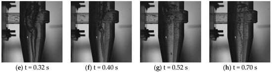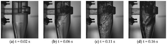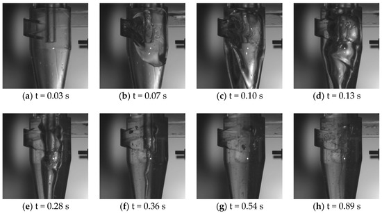 Figure 15 shows the visualized flow of bubbles in the spiral inlet cyclone. The experimental conditions were the same as for the rectangular inlet cyclone. When the system return oil entered the spiral inlet cyclone, it was affected by gravity, forming an asymmetrical liquid stream along the inner wall with visible bubbles, and the oil rapidly swirled along the inner wall. The stratified funnel-shaped air column was obliquely erected, and the air column filled the upper part of the inside of the cyclone. The swirling air column gradually shrank until it had all overflowed from the exhaust port. After 0.89 s, the bubbles below the exhaust port of the cyclone were arranged to form a visible undulating line. As the bubbles continued to overflow throughout the entire swirling process, there was less accumulation of bubbles above the inside of the cyclone.