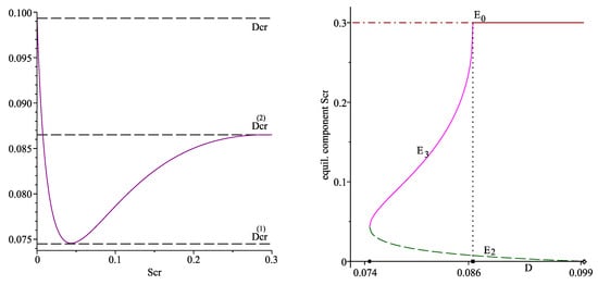 If then Equation (11) may possess up to 4 real positive solutions with respect to . If there exists at least one positive solution of (11), say , such that for some values of D, we shall have an interior (with positive components) equilibrium of the form