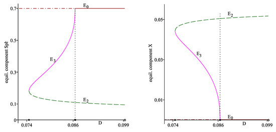 Figure 1 (right plot) and Figure 2 also visualize the stability of , and : the solid lines correspond to the components of the stable equilibria, the dash and the dash-dot lines mark the components of the unstable equilibria. Therefore, these three plots can also be considered as bifurcation diagrams: a saddle node bifurcation occurs at the parameter value , and serves as a transcritical bifurcation point.