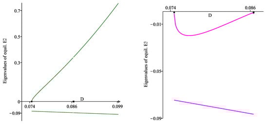 The third root is found numerically by computing the right-hand side expression on a discrete mesh of values for D, where for , and for . Figure 3 visualizes the three eigenvalues of and . One can see that the eigenvalues of are negative (right plot), and possesses one real positive eigenvalue (left plot). Moreover, one eigenvalue of approaches zero at , and one eigenvalue of approaches zero at and , thus and are bifurcation parameter values.