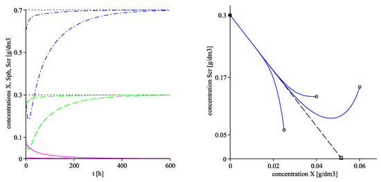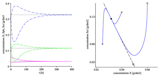 We compute the equilibrium points of the model and investigate their local asymptotic stability as well as existence of bifurcations in dependence of the input control parameter D, the dilution rate. It is shown that an equilibrium , corresponding to total wash-out of the biomass in the bioreactor, exists for all . We find values of D such that two interior (coexistence) equilibria and do exist: is defined for , and exists if . Local stability analysis shows that is locally asymptotically unstable and is locally asymptotically stable where they exist, is locally asymptotically stable for . Two types of bifurcations of the equilibria occur, a saddle node bifurcation at where and coalesce, and a transcritical bifurcation at , where coincides with and disappears for . Practically, the bifurcation values and of D should be carefully avoided, because small nearby perturbations may cause destabilization of the process, leading to total wash-out of the biomass. Most of the computations are carried out numerically due to the complicated expression of the model function and the large number of model parameters. The computations are performed in the computer algebra system Maple. The most important property of the model solutions—existence, uniqueness and uniform boundedness—is established theoretically in Theorem 1. We also prove (Theorem 2) the global asymptotic stability of the interior equilibrium point when D takes values within certain bounds, , . The existence of these bounds for D is not restrictive in practical applications, since the dilution rate D is proportional to the speed of the pumping mechanism which feeds the bioreactor, thus there always exist a lower and an upper bound for D [27]. Choosing D in the interval ensures practically long-term sustainability of the bioremediation process in the bioreactor. On the other hand, large values of the dilution rate D, , may cause total wash-out of the biomass in the reactor and may lead to process breakdown. This is due to the fact that the wash-out equilibrium is the global attractor of the dynamics (Theorem 3). The dynamic behavior of the model solutions is illustrated by some numerical examples for different values of the dilution rate.