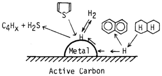 - Fujimoto, K.; Ohno, A.; Kunugi, T. Liquid phase hydrogenolysis of thiophene by decaline as hydrogen donor with metal supported active carbon catalysts. Stud. In Surf. Sci. Catal. 1983, 17, 241–249. [Google Scholar]