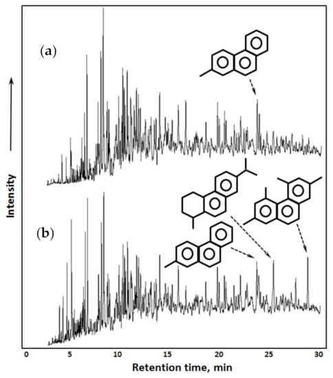 - Vakhin, A.V.; Mukhamatdinov, I.I.; Aliev, F.A.; Kudryashov, S.I.; Afanasiev, I.S.; Petrashov, O.V.; Sitnov, S.A.; Chemodanov, A.E.; Varfolomeev, M.A.; Nurgaliev, D.K. Aquathermolysis of heavy oil in reservoir conditions with the use of oil-soluble catalysts: Part II—Changes in composition of aromatic hydrocarbons. Pet. Sci. Technol. 2018, 36, 1850–1856. [Google Scholar] [CrossRef]