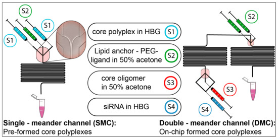 Production methods for polyplexes from oligomers and siRNA. Formulation components used are depicted with the id label of their corresponding syringe (S1–S4). Two different channels were used to produce nanoparticles during solvent exchange, a single meander channel (left) and a double meander channel (right). In the single meander channel, pre-assembled core particles (S1) were mixed with lipid anchor polyethylene glycol (PEG)-ligand oligomer (S2). In the double meander channel, the polyplex was assembled by microfluidics in two subsequent steps from its starting components (S3, S4, S2). PEG: polyethylene glycol. HBG: HEPES buffered glucose pH 7.4. Core oligomer (S3): cationic lipo-oligomer. Lipid anchor-PEG-ligand (S2): oligomer containing fatty acids to hydrophobically adsorb to the core oligomer, a PEG chain and folic acid as ligand for the folate receptor. Core polyplex (S1): polyplex from siRNA (S4) + core oligomer (S3). Reproduced with modification from Loy et al., 2019 [30], https://doi.org/10.7717/peerj-matsci.1/fig-1. under copyright permission from PEERJ.