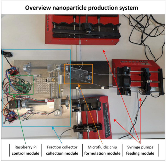 A detailed description of the automated nanoparticle production system, its hardware, and its software is provided. The control module is inexpensive, and its parts are readily available. The feeding module integrates syringe pumps as commonly applied in microfluidic systems such as in Liu et al. (PHD 2000, Harvard Apparatus) [36], Debus et al. (Aladdin, World precision Instruments) [37], Lim et al. (model unspecified, Harvard Apparatus) [38], Karnik et al. (SP220I, World Precision Instruments and PHD 22/2000, Harvard Apparatus) [39], and Belliveau et al. (KD200, KD Scientific) [27]. The schematics of the collection module are published together with this paper on GitHub [32], enabling the replication of this module in any workshop. Additionally, building the collection module with additive fabrication methods, e.g., 3-D printing, might also be feasible.