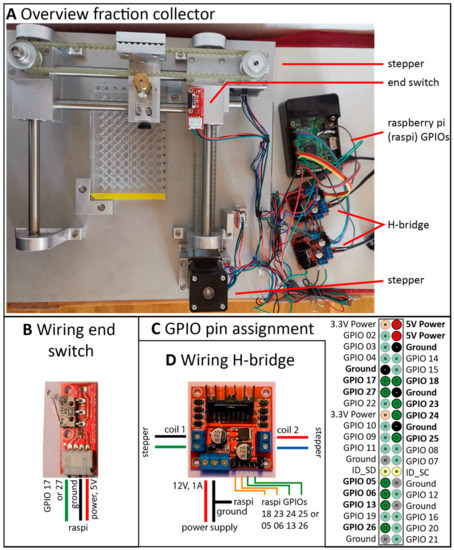 The fraction collector is controlled by a raspberry pi 3, model B running Raspbian GNU/Linux 9 (stretch). The raspberry pi controls the fraction collector via input/output (GPIO) pins. Figure 3 shows an overview of the complete fraction collector (Figure 3A), the wiring of each component (Figure 3B,D), and the GPIO pin assignment (Figure 3C).