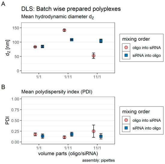 Figure 4 demonstrates the influence of formulation parameters on polyplexes formulated from two components by rapid pipetting. By adjusting the volume ratios and the mixing order of the oligomer and siRNA solutions, significant changes in size (hydrodynamic diameter) and polydispersity index (PDI) can be achieved.