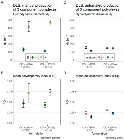 In Figure 5C,D, polyplexes from the three educts were produced automatically inside the double meander channel (DMC) by the nanoparticle production system. In the first mixing zone, CO and siRNA were mixed. The color and the shape of the data points indicate if CO was dissolved in HBG with or without 50% acetone. In the second mixing zone, LPO or LPOE was added to the mixture. Polyplexes prepared from CO dissolved in HBG only showed slightly higher hydrodynamic diameters dZ and PDI (CO + siRNA + LPO: dZ = 153.0 ± 12.7 nm, PDI = 0.210 ± 0.062; CO + siRNA + LPOE: dZ = 148.2 ± 8.7 nm, PDI = 0.306 ± 0.003) in comparison to polyplexes prepared from CO dissolved in HBG with 50% acetone (CO + siRNA + LPO: dZ = 114.7 ± 1.5 nm, PDI = 0.137 ± 0.045; CO + siRNA + LPOE: dZ = 141.9 ± 4.7 nm, PDI = 0.230 ± 0.022).