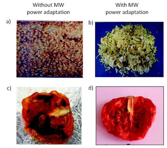 Dried tomato and onion with and without MW power control are shown in Figure 1 [44]. Successful application of MW drying was found with potato chips, pasta, and snacks [46]. Because of the supply of drying energy directly to the volume of a product, its internal pressure will increase, which will drive water to the plant surface, resulting in an increase in drying rates [47,48]. However, depending on the type of material, MWs in some cases cannot fully complete drying and are usually combined with hot air drying or vacuuming. So even though both MW heating and hot air drying separately have disadvantages, combining these two methods could prove very beneficial. In that sense, the application of MW to the finalized drying of banana slices (T = 60 °C) reduced hot air drying by about 64%.