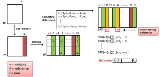 A typical SRD input matrix consists of the comparable methods in the columns and the measured variables in the rows. The comparison of the methods is completed based on the rows. The last column of the input matrix serves as the reference (or benchmark) column. The reference can be set as minimum, maximum, average and user defined (e.g., golden standard). This is really important, as the data values in each column are ranked in increasing magnitude and these rankings are compared to the ranks of the reference column. Finally, the absolute differences between the rank-variables and the rank-reference columns in each case are calculated and summed. These values (SRD values) give the ordering of the variables. The smaller the SRD value, the better (or the more consistent) the variable. The procedure above is explained in detail in one of the recent works. The visual representation of the method is provided by Figure 2 [107].