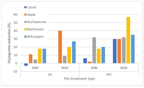 As a contrast to ultrasound, the vast majority of scientific publications show that PEF pretreatment facilitates mass transfer during drying. Drying reduction by PEF prior to water removal varies from 2% to 57% in comparison to untreated material, as it was reported for apples and basil leaves, respectively (Figure 3). The effect of PEF on drying depends on many different factors which are related to the material properties and processing parameters: electric field intensity, energy input, number of pulses, pulse width and geometry or drying methods [134].