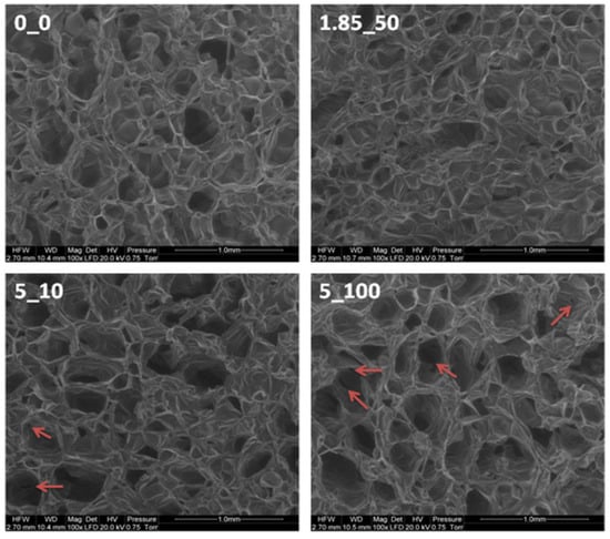 SEM images of untreated (0_0) and PEF treated (1.85_50—E = 1.85 kV cm−1, n = 50 pulses; 5_10—E = 5 kV cm−1, n = 10 pulses; 5_100—E = 5 kV cm−1, n = 100 pulses) fresh apple tissue. Red arrows indicate the damages and ruptures in cell structure. Magnification of × 100. E—electric field intensity of applied PEF [kV cm−1]; n—number of pulses. Source: own elaboration, unpublished data.