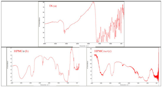 The FT-IR spectra of: TX (a), HPMCE5 (b), and HPMC15kcP (c).