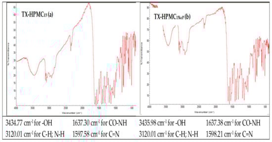 FT-IR analysis was performed on the TX and physical mixtures of TX-HPMCE5 (1:1) and TX-HPMC15kcP (1:1). A total of 150 mg KBr and 1 mg of each sample were mixed and compressed using a hydraulic press. The obtained pellets were scanned in the following experimental conditions: spectral-domain 400–4000 cm−1; resolution of 4 cm−1; eight scans. The FT-IR spectra of the samples were collected using an FT-IR Spectrometer Thermo-Nicolet, an Avatar 330, and Omnic 10.1 software. The FT-IR studies were done at room temperature (25 °C ± 2 °C). This method was used to conduct a preliminary study on the development of polymeric films with TX. This method did not involve thermal stress on the samples, and a physical–chemical modification did not occur during spectrometry.