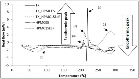 The differential scanning calorimetry thermogram of TX (a), HPMCE5 (b), HPMC15kcP (c), and physical mixtures TX-HPMCE5 (d) and TX-HPMC15kcP (e).