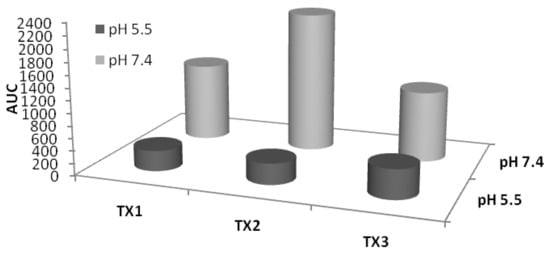 The AUC values (Table 2 and Figure 6) indicated a major influence of the acceptor medium pH on the dissolution rate. Formulation TX1 presented a dissolution rate four times higher at pH 7.4 compared to pH 5.5. At pH 7.4, the dissolution rate increased almost sevenfold for the TX2 formulation and threefold for TX3. At pH 5.5, AUC values showed an increasing dissolution rate in the order TX1 < TX2 < TX3, indicating the polymer type and the concentration as influencing parameters. Similar behavior was observed at pH 7.4 for formulations TX1 and TX2. The AUC value for TX3 indicated a different dissolution, correlated with the high-viscosity polymer matrix and a higher concentration of polymer.