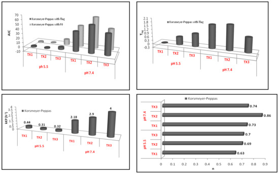 Using the obtained data (Table 4 and Figure 7), it may be deduced that the Korsmeyer–Peppas model describes a non-Fickian transport mechanism. The n values varied between 0.63–0.7 at pH 5.5 and 0.73–0.86 at pH 7.4, suggesting a diffusion depending on the matrix hydration and polymer relaxation. To analyze the diffusion of TX from the matrix, the dissolution-curve fitting was realized in the period of a maximum of 60% of the initial concentration of TX dissolved. Taking into consideration the differences in experimental conditions for the discrimination of models, the Akaike information criterion (AIC) was used. The Akaike index is a ”goodness of fit” type indicator of the best fit model possessing the lowest AIC value (Table 4).