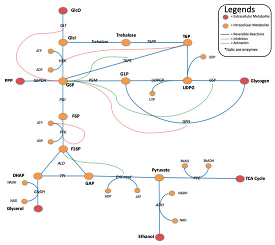- Voit, E.O. Biochemical and genomic regulation of the trehalose cycle in yeast: Review of observations and canonical model analysis. J. Theor. Biol. 2003, 223, 55–78. [Google Scholar] [CrossRef]