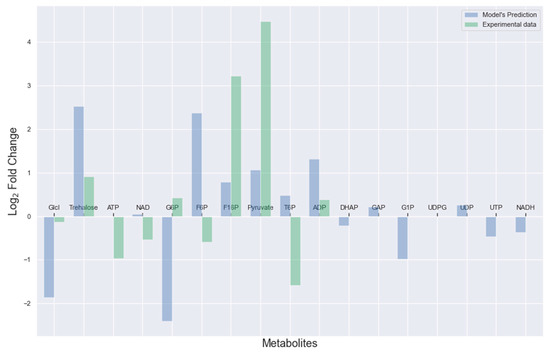 Log2 fold changes of metabolites from 30 °C to 37 °C generated by the trehalose metabolism model. With comparison from data measured experimentally by Puig-Castellví et al. [19] for intracellular glucose (GlcI), trehalose, adenosine triphosphate (ATP), and nicotinamide adenine dinucleotide (NAD) at 37 °C and Postmus et al. [8] for glucose-6-phosphate (G6P), fructose-6-phosphate (F6P), fructose-1,6-bisphosphate (F16P), trehalose-6-phosphate (T6P), and adenosine diphosphate (ADP) at 38 °. Remaining metabolites had no reference experimental data for comparison.