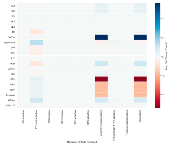 Of all the reactions investigated, the removal of modifiers involved in the upper part of glycolysis (GLT inhibition, HXK inhibition, T6PS activation, GSY activation and GPH inhibition) caused significant changes in fluxes relative to the original model’s flux values when protein concentrations collected under 37 °C were used (Figure 4, Table S3). When there is no inhibition in upper glycolysis, the trehalose cycle’s fluxes see a drop, along with a massive decrease in the reaction where glycogen is broken down into glucose-1-phosphate, catalysed by glycogen phosphorylase and with a huge increase in flux towards the pentose phosphate pathway. When the activation of pyruvate kinase is removed, there is a slight increase in flux within the trehalose cycle, but with drops observed in the entry to the trehalose cycle and lower glycolysis.