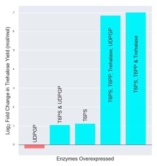 To determine the best target for metabolic engineering in S. cerevisiae in order to achieve higher trehalose production, overexpression simulations (doubling the enzymes’ concentration) were performed with the model. Overexpression was chosen as the in silico modification of choice as this is a proven method in increasing metabolite production in metabolic models [26,27]. In order to narrow down the search of enzymes to overexpress, metabolic control analysis [28,29] was performed. It suggested that UDP-glucose phosphorylase and trehalose-6-phosphate synthase increase would result in higher trehalose accumulation. That was proved incorrect for UDP-glucose phosphorylase (Figure 5), but true for trehalose-6-phosphate synthase. However, overexpression for the trio of enzymes involved in trehalose production and degradation of trehalose delivered the best results in trehalose accumulation with 10000% increase in yield (Figure 5). Yield here is calculated by dividing the trehalose value at steady state by the extracellular glucose value.