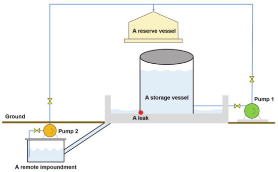 11], a mitigation system in which a reserve vessel is installed next to a storage vessel was proposed. In this system, two vessels are connected with a pipe and the chemical material in a storage vessel is moved to a reserve vessel by a pump when leakage occurs, reducing the amount of leakage. However, the dangerous materials that can leak to the outside should be handled properly. The NFPA (National Fire Protection Association) 30 code provides a remote impounding system as a secondary containment [