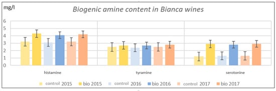 In wine making technology, the volatile acid content is an especially important factor. Our present study showed that all the problematic values were under the critical limit (1 g/L). The results of the biogenic amine content in “Bianca” wines, 2015–2017, are shown in Figure 1. The glycerin content correlated with the literary values, since its well known that the glycerin-pyruvic acid transformation results in a 6–10 g/L concentration.