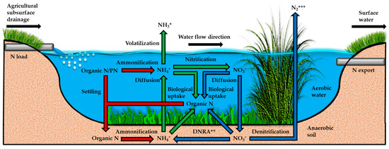 - Steidl, J.; Kalettka, T.; Bauwe, A. Nitrogen retention efficiency of a surface-flow constructed wetland receiving tile drainage water: A case study from north-eastern Germany. Agric. Ecosyst. Environ. 2019, 283. [Google Scholar] [CrossRef]