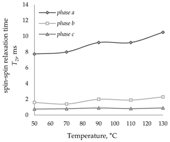 At temperatures below 20 °C in the bitumen sample, the molecular mobility is so low that the sample is characterized by constant relaxation time. At temperatures above 50 °C for bitumen samples (oxidation products), due to an increase in the intensity of molecular movements and averaging of local magnetic fields, the value of T2i increases, and the dependence of the spin–spin relaxation time on the experimental temperature is observed, whereby three phases are found in the samples.