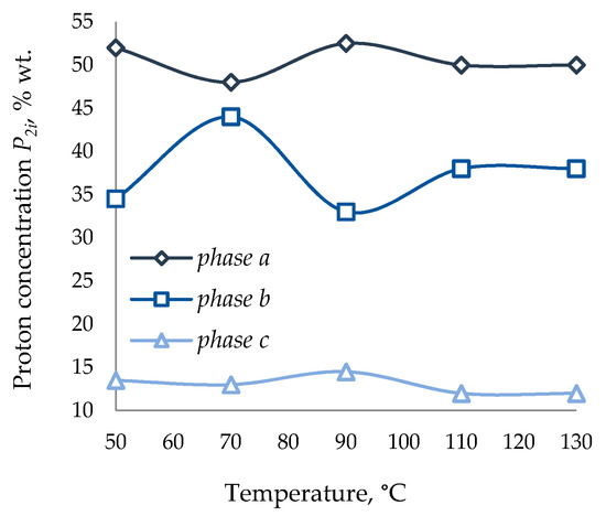 However, the constant P2 value, which is responsible for the true content of oil, resin and asphaltenes, as the duration of the oxidation process increases with an increase in the softening point of the obtained bitumen, shifts to the region of higher experimental temperatures. So, for bitumen with a softening point of 46 °C, a constant value of P2 was observed in the temperature range of 110–130 °C. With an increase in the duration of the oxidation process, the reaction products accumulate asphaltenes (phase Pc) with a slight change in the concentration of resins (phase Pb), with a sharp decrease in the content of hydrocarbons in oils (phase Pa). An increase in the oxidation time is accompanied by a decrease in the concentration of phase a protons, and an increase in the concentration of protons in phases b and c (Figure 5). Comparison of the results of the analysis of the quantitative component composition of HRO, determined by adsorption liquid chromatography and by pulsed NMR spectroscopy, allows us to conclude that their convergence is quite good (Table 1).