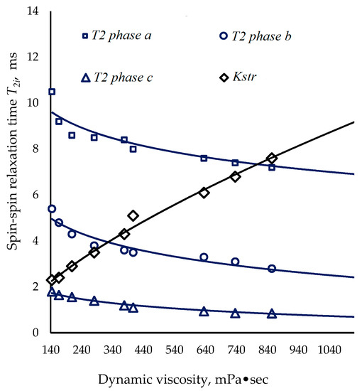 An increase in the viscosity of oxidation products of HRO with an increase in the duration of the process is due to an increase in the content of resins and asphaltenes in them and to a high degree of their association with the formation of a rather strong structure, as evidenced by a decrease in the spin–spin relaxation time of phases. Pulsed NMR parameters (spin–spin relaxation time T2i and proton concentration P2i) reflect thermodynamic properties of components of the HRO oxidation products, and depend on their dynamic viscosity. The viscosity of the HRO oxidation products is defined by the composition and mobility of components: HC, resins and asphaltenes. An inverse dependence of the viscosity and molecular mobility of components of HRO oxidation products is observed (Figure 6).