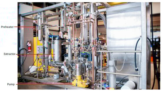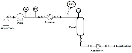 The subcritical water extraction process, obtained by BioFoodTech, consists of a pump, preheater, extractor, and condenser (see Figure 2 and Figure 3). Instruments used in the experimental setup include a pressure indicator (PI), temperature indicator (TI), flow transmitter (FT), and a pressure relief valve (PRV). The flowrate used in the extraction system was 87 mL/min. The system used in this study involved open-ended flow. Finally, the extract consisted of phenols mixed with water at the outlet of the condenser.