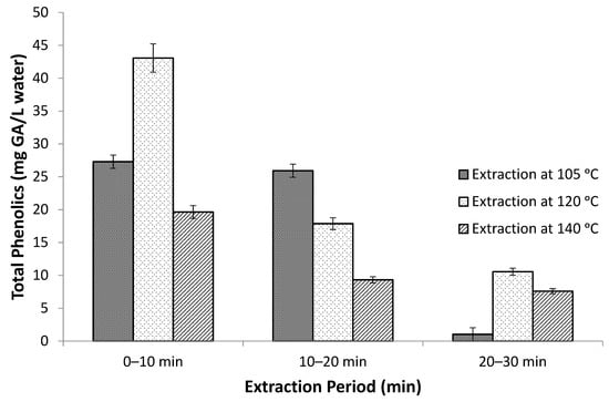 The extraction yields for a week one sample at different extraction temperatures are presented in Figure 5. It was observed that the extraction yields reduced over the extraction time under all operating temperatures, similar to the observations seen in Figure 4. Figure 5 also indicates that the yields showed the highest values at low extraction temperatures. At 105 °C, water has the highest polarity [,] as compared to water at 120 °C and 140 °C, which results in higher extraction of phenolic compounds. The results from this study also showed total phenolics extractions higher than those presented by Figueroa et al. [] by at least three times. As represented in the Design of Experiment (DOE) analysis and Figures, the variance in the experimental factors was low, indicating a repeatable nature of the experiments. Extraction time also impacted the total phenolics yields obtained.