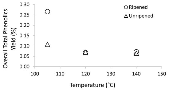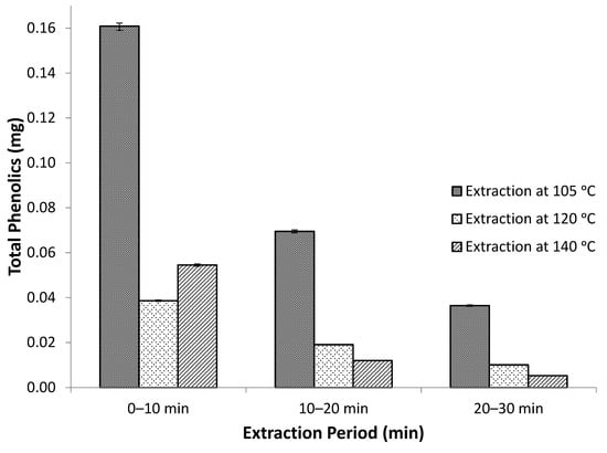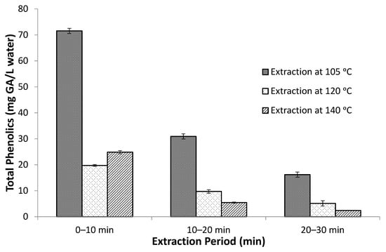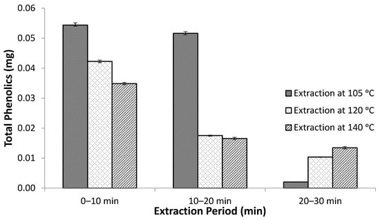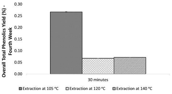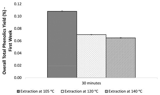 The overall total extraction yields (the sum of all the total phenolics yields at a given temperature over the total extraction period) for a first week avocado sample (i.e., after 30 min of extraction time) at different extraction temperatures are shown in Figure 6. As discussed previously, due to high water polarity at lower temperatures, the extract yields showed the highest values at 105 °C. It was also observed that extraction yields at 120 °C and 140 °C had very close yields to each other. This was due to the exponential reduction of water polarity with increased extraction temperatures [,]. In addition to lower water polarity at higher temperatures, high temperatures degrade the quality of the total phenolics if exposed for long periods of time. This could explain another factor that may have led to the reduced total phenolics in each of the tests. Unlike other fruits that require higher extraction temperatures to allow subcritical water to penetrate their thicker surface (such as potato extractions obtained by Alvarez et al. []), subcritical water can penetrate the avocado flesh at lower temperatures; hence, it showed higher extraction yields at lower temperatures.