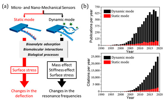 Regarding the working principle, nanomechanical sensors, which are based on the study of the deformation of flexible structures at the nanoscale, can be split into two main groups: static mode and dynamic mode sensors [16,17] (Figure 1a). While the static mode is based on detecting changes in the deformation state of the sensor, the dynamic one is based on detecting changes of the mechanical resonances of such flexible structures. Although the use of both operation modes dates from the mid 1990s, the dynamic mode spread more rapidly, and nowadays, it encompasses around 80% of the research works in this field (Figure 1b).