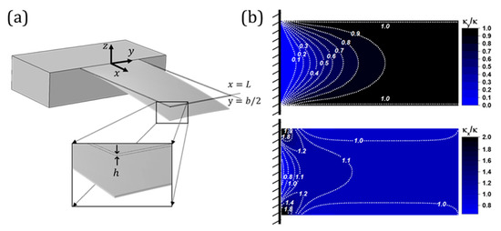 (a) Schematic of a cantilever plate that has been bent by the action of differential surface stress between the upper and lower faces. (b) Contour lines of the longitudinal and transversal curvatures normalized to Stoney’s curvature for a cantilever plate. It can be seen that, far from the clamped region, both curvatures follow Stoney’s equation, which is not the case for the region close to the clamping.