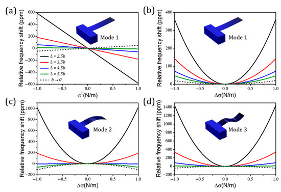 As an example, Figure 3a shows the relative frequency shift due to net surface stress for a silicon nitride cantilever with a thickness of 100 nm and length of 20 µm, for different values of the aspect ratio, and as a function of the net surface stress. Equation (17) is formed by two terms that correspond to the two different effects described above. The geometric term is inversely proportional to the thickness of the cantilever, while the residual stress term is proportional to . It is interesting to note that these two effects have opposite signs; therefore, a cantilever could be designed with specific characteristics in order to avoid net surface stress effects on the frequency or, on the other hand, to maximize the effect in order to have a better measurement of the surface stress.