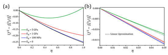 (a) Influence of the adsorbed layer on the flexural modes of a silicon beam as a function of the ratio between thicknesses and for different values of the Young’s modulus of the adsorbed material. (b) Same graph, but at the range of values of where the linear approximation (21) can be applied.