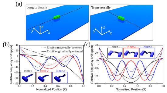 (a) Schematic depiction of a bacterium adsorbed longitudinally and transversally oriented on a resonator. (b,c) Relative frequency shift produced by the adsorption of a typical E. coli bacterium on a silicon nitride cantilever and a doubly clamped beam of 200 × 20 × 0.6 µm for the first three flexural modes. It can be seen that, because of the edge effects of the bacterium, the stiffness effect is considerably smaller when the bacterium is transversally oriented.