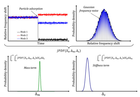 Schematic of the particle’s mass and stiffness determination using multimode measuring. In a first step, the frequencies of the resonator are tracked and the relative frequency shifts produced by the particle adsorption are recorded. In a second step, the joint probability density function () is formed using the frequency noise for each of the modes being tracked. Finally, the can be integrated in the normalized position and either in or to obtain the mass or the stiffness , respectively.