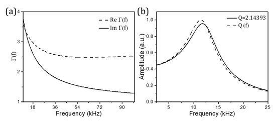 where . Figure 7a shows the real and imaginary parts of the hydrodynamic function of a rectangular cantilever of 200 μm by 20 μm typically used in sensing applications.