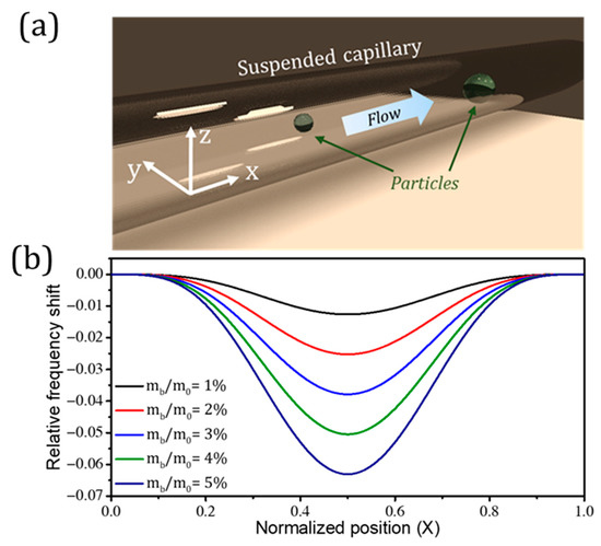 (a) Schematic depiction of a hollow transparent suspended capillary with flowing particles inside. (b) Theoretical prediction of the relative frequency shift for the first mode of the capillary for different masses as a function of the position.
