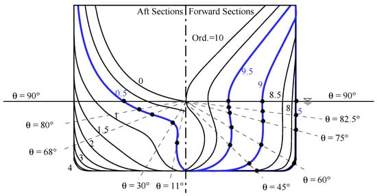 The RIOS bulk carrier, which was the target ship in an innovative experiment [14] to measure the unsteady pressure distribution on the whole ship surface, is considered in this study, and Table 1 gives its main particulars. The Froude number, Fn = U/(gL)1/2, is equal to 0.18. In the experiment [14], a total of 234 pressure sensors were attached on the RIOS bulk carrier. The Fiber Bragg Gratings (FBG) sensor was adapted, which is based on optical-fiber sensing technology. In this study, the wave-induced pressure for some representative positions of the ship surface is compared with the experimental data. The distance between aft perpendicular (AP) and forward perpendicular (FP) is divided into evenly spaced ordinates, which are equal to 0.0 and 10.0 for AP and FP, respectively. In the present comparison, four sections—ordinate (Ord.) = 9.5, 9.0 (near bow), 5.0 (mid-ship), and 0.5 (near stern)—are selected, and the position of pressure measurement in each section is represented as the angle θ from the keel line. That means 0° indicates the keel-line, and 90° indicates the still-water-level, as shown in Figure 1.